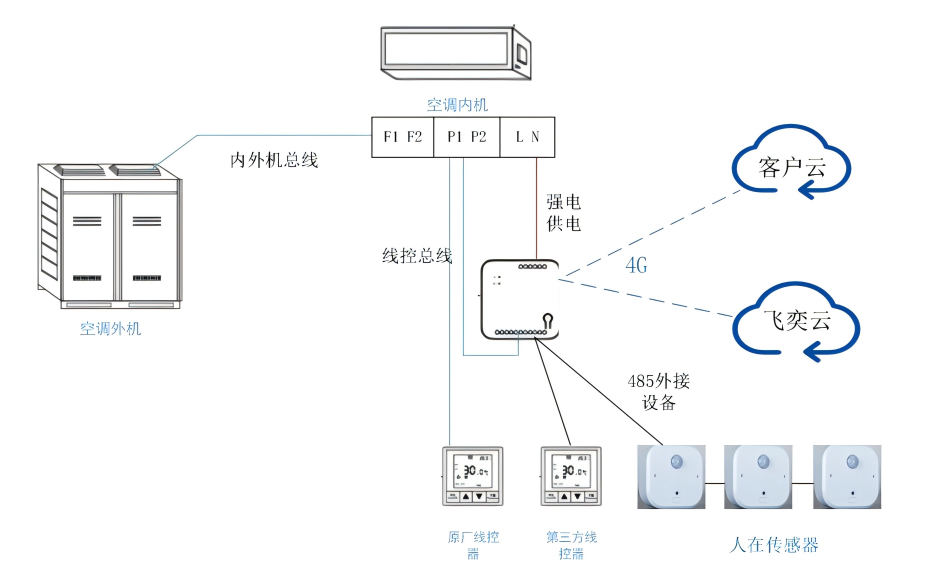 可以单独接空调使用,也可以与空调原厂线控器共存且主从自适应无需手动设定,也可以对接第三方线控器替换原厂线控器。
